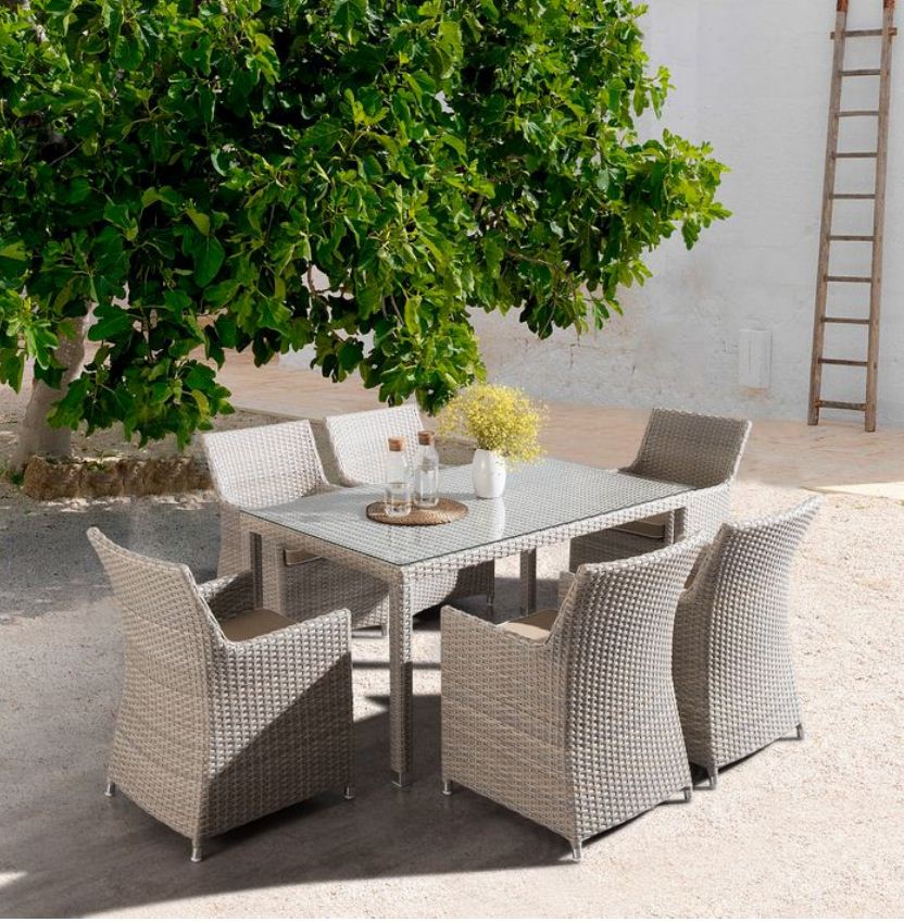 MESA COMEDOR RECTANGULAR, con estructura de aluminio y uniones de aluminio reforzado para obtener un mueble resistente y de alta durabilidad, el tejido es de rattan sintético trenzado en color toast, esta fibra de alta calidad no procede de resinas recicladas, por lo que son indeformables y muy resistentes al sol y a la humedad así pues, este mueble puede permanecer en el exterior sin necesidad de protección o mantenimiento alguno, aunque para alargar la vida útil de su mueble de exterior aconsejamos tapar con una funda opaca e impermeable si no se van a utilizar en periodos prolongados de tiempo. Protección en las patas con casquillos de aluminio y tacos de plástico. Incluye cristal templado de 5mm de grosor con ventosas para una segura sujeción del cristal. Combinado con el resto de piezas de esta misma colección, conseguirás transformar tu terraza en una elegante zona de confort y relax