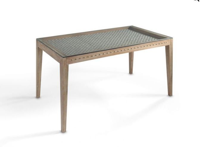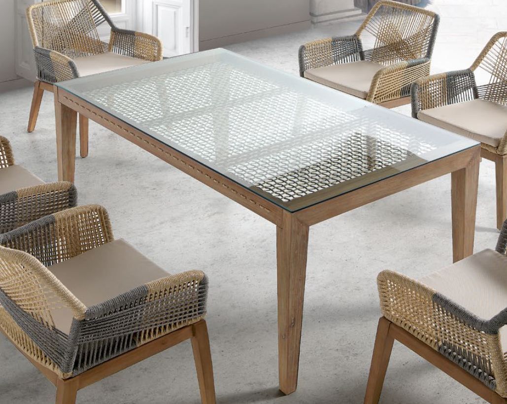 Mesa comedor de estructura en madera de caoba y acabado color Stonewash, tejido en cuerda náutica de poliéster de alta calidad y muy resistente en color tiramisú y platinum con cristal templado.