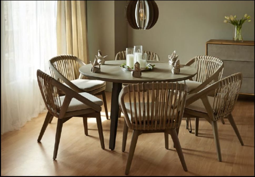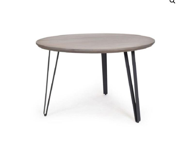 Mesa de comedor redonda DRACO de 130 de diámetro, con tapa de madera de mahogany y patas en acero color antracita.