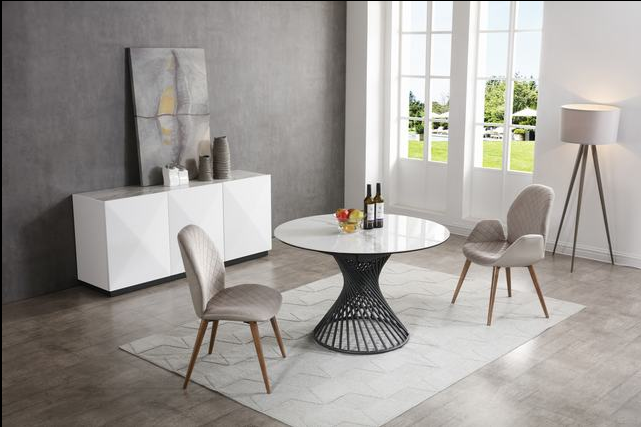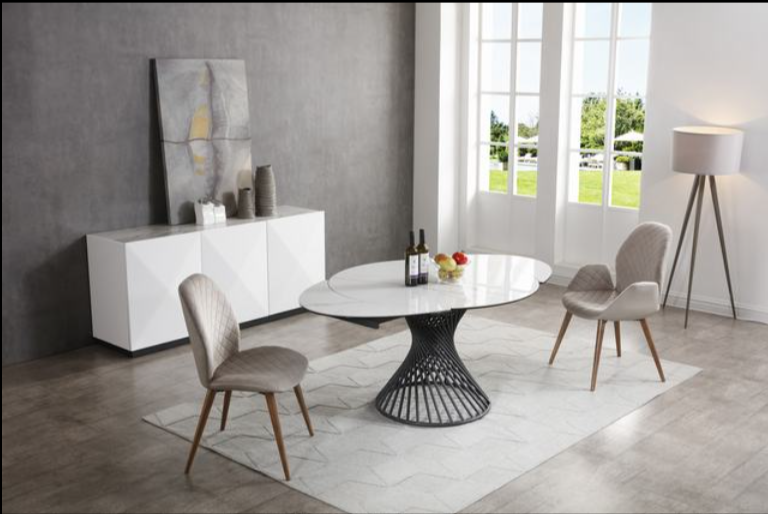 Material estructura: Mesa giratoria Tapa : vidrio de 8 mm + cerámica de 5 mm blanco. Estructura y patas: metal recubierto de polvo negro liso.