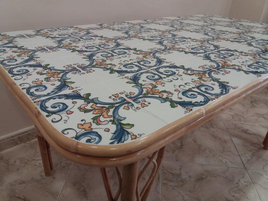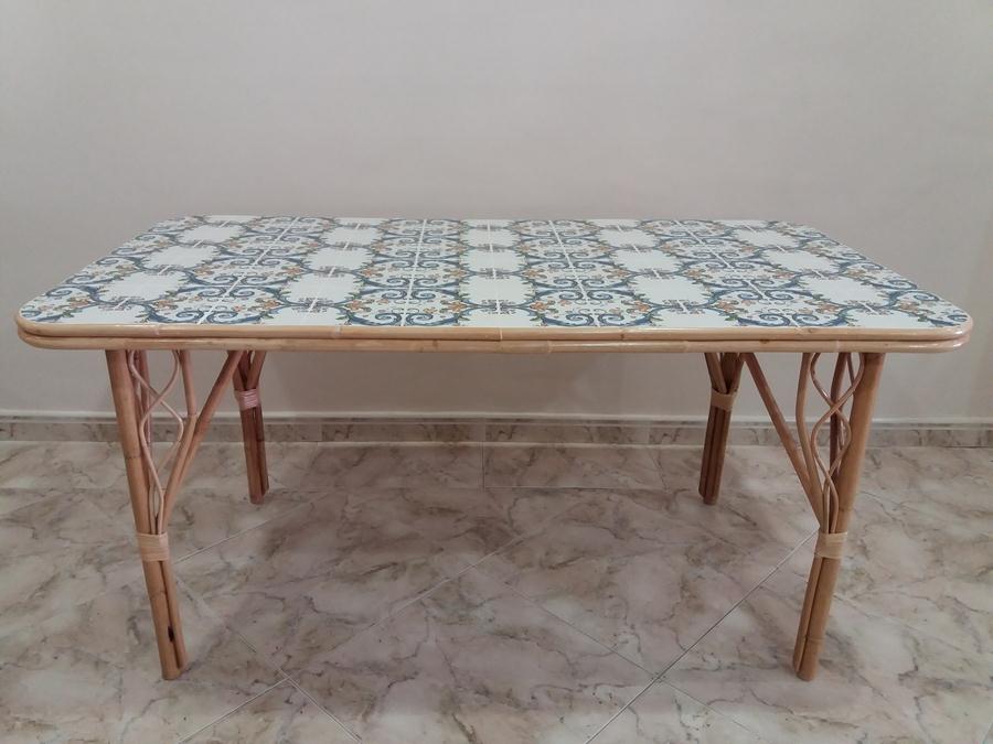 MESA COMEDOR DE CAÑA NATURAL CON TAPA DE  CERAMICA MEDITERRANEO.