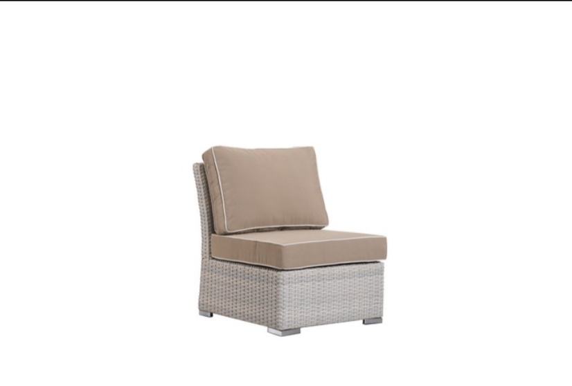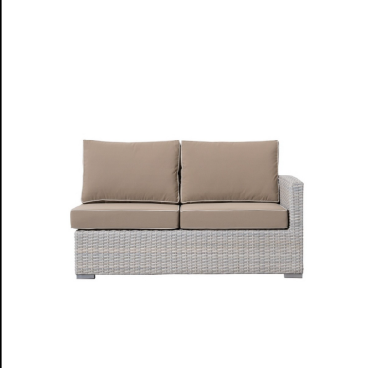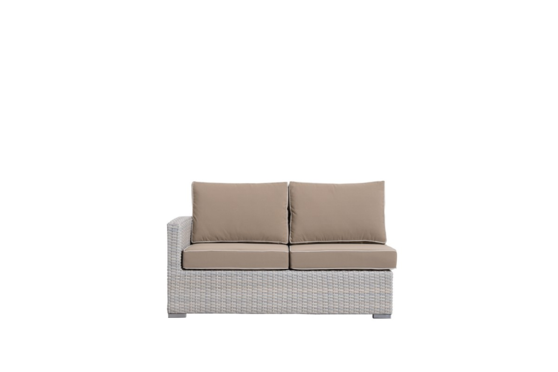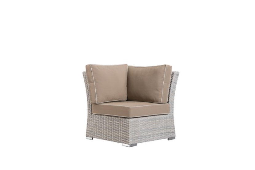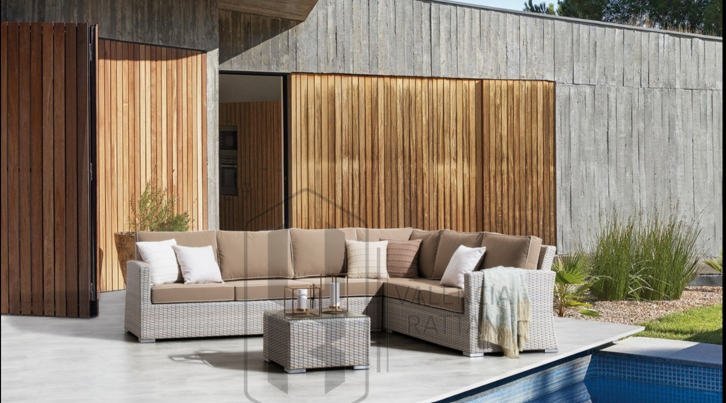 RINCONERA CALMA, con estructura de aluminio y uniones de aluminio reforzado para obtener un mueble resistente y de alta durabilidad, el tejido es de rattan sintético trenzado de 10mm en color toast, esta fibra de alta calidad no procede de resinas recicladas, por lo que son indeformables y muy resistentes al sol y a la humedad así pues, este mueble puede permanecer en el exterior sin necesidad de protección o mantenimiento alguno, aunque para alargar la vida útil de su mueble de exterior aconsejamos tapar con una funda opaca e impermeable si no se van a utilizar en periodos prolongados de tiempo. Protección en las patas con casquillos de aluminio y tacos de plástico. Tapicería Olefin 100% color único, con tratamiento repelente a líquidos y manchas, anti-moho, antibacteriano, filtro rayos ultravioleta, con solidez del color a la luz 7/8, a la fricción y al agua clorada de las piscinas. El espesor de la tapicerías es de 12 cm el asiento y 11 cm el respaldo, siendo estas completamente desenfundables para facilitar la limpieza. Tejido OECO-TEX, respetuoso con el medio ambiente. Los módulos llevan enganches entre ellos para una mejor unión y fijación para que puedas crear tus composiciones adaptándose a tus necesidades de espacio y forma de tu jardín o terraza.