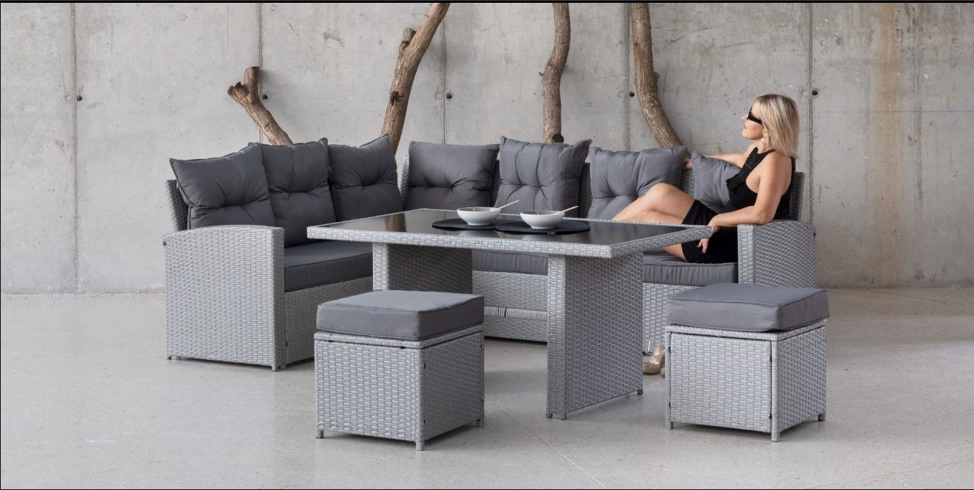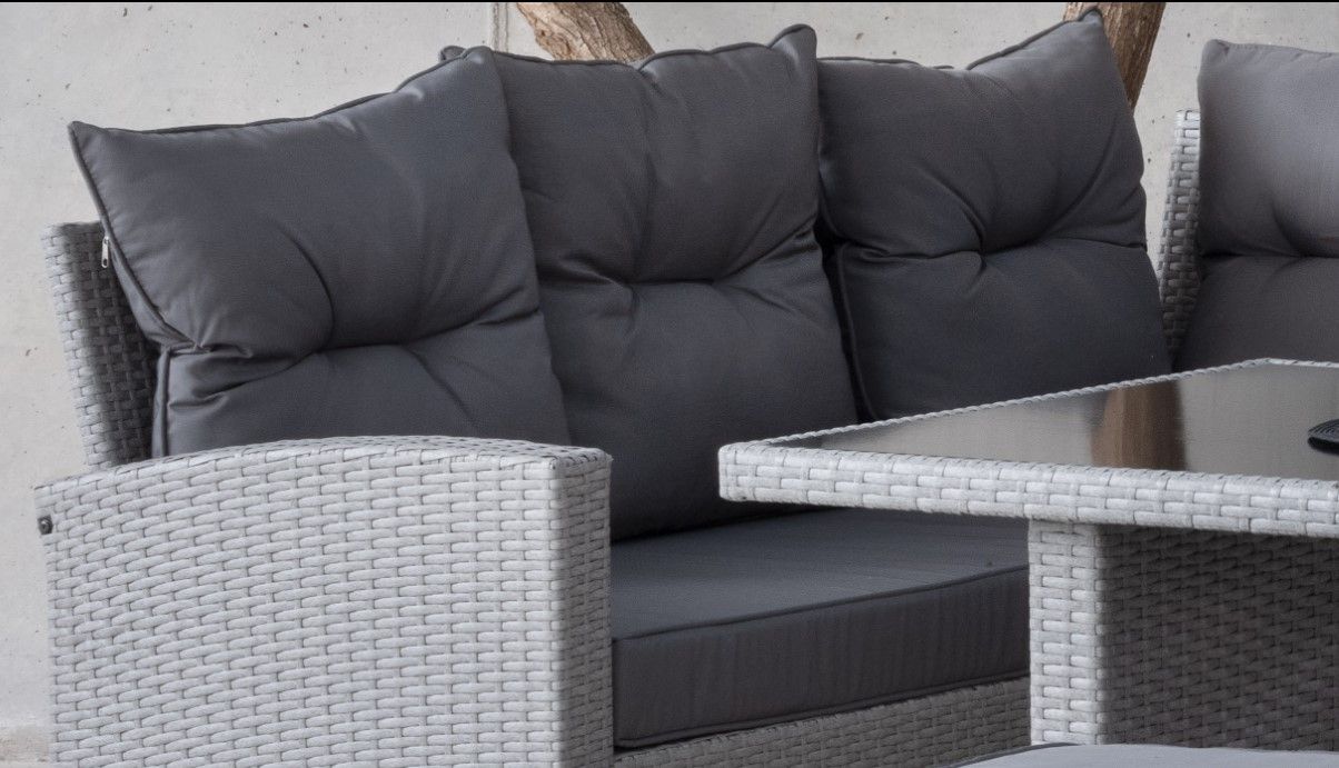 2 SOFAS DE 3 PLAZAS + MESA ALTA + 2 REPOSAPIES.