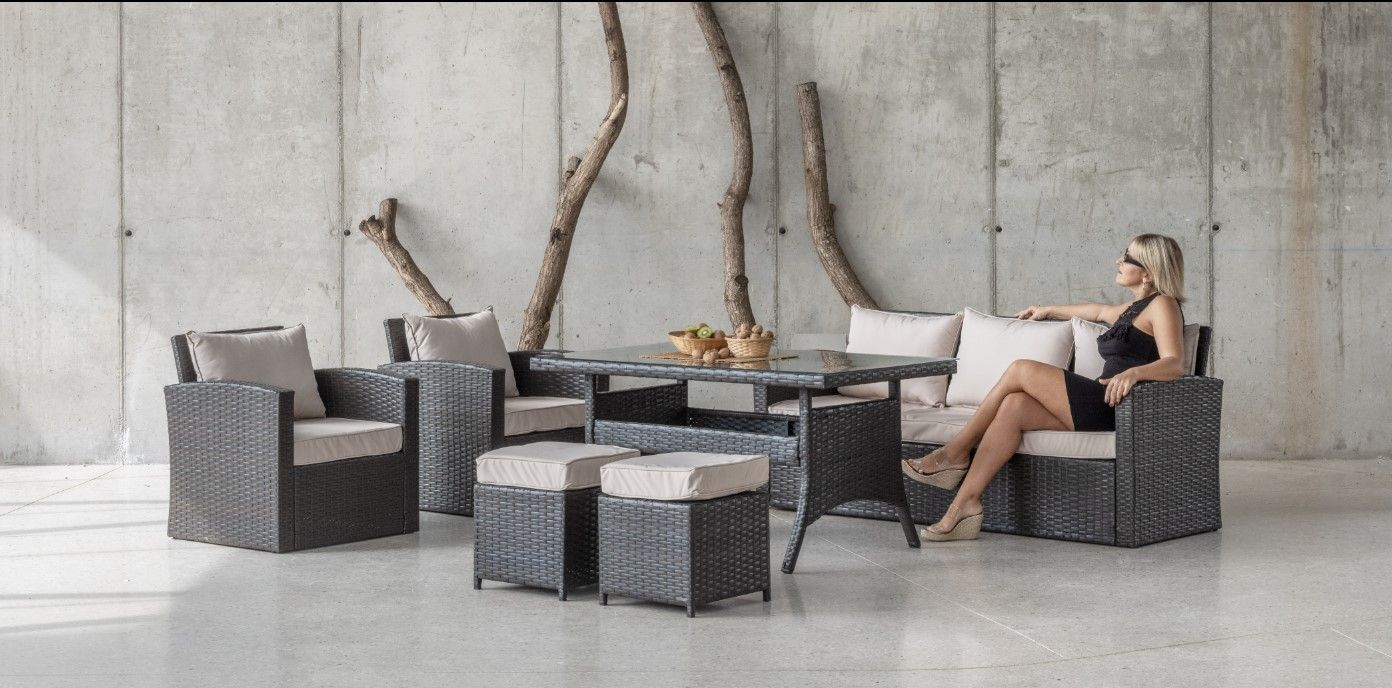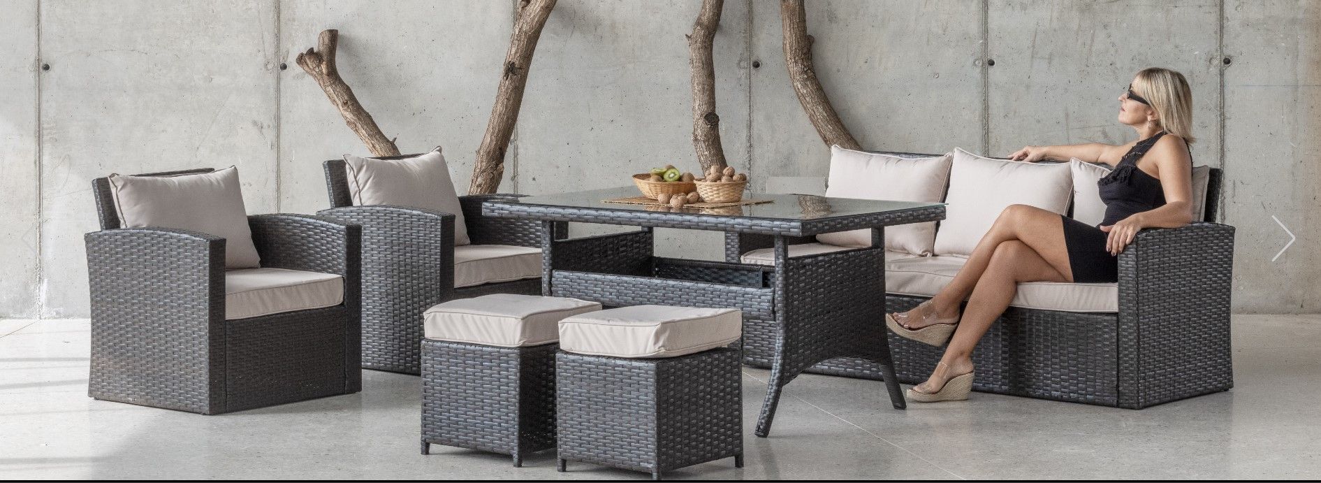 2 SILLONES + 1 SOFA 3 PLAZAS + TABURETES + MESA CENTRO + COJINES.