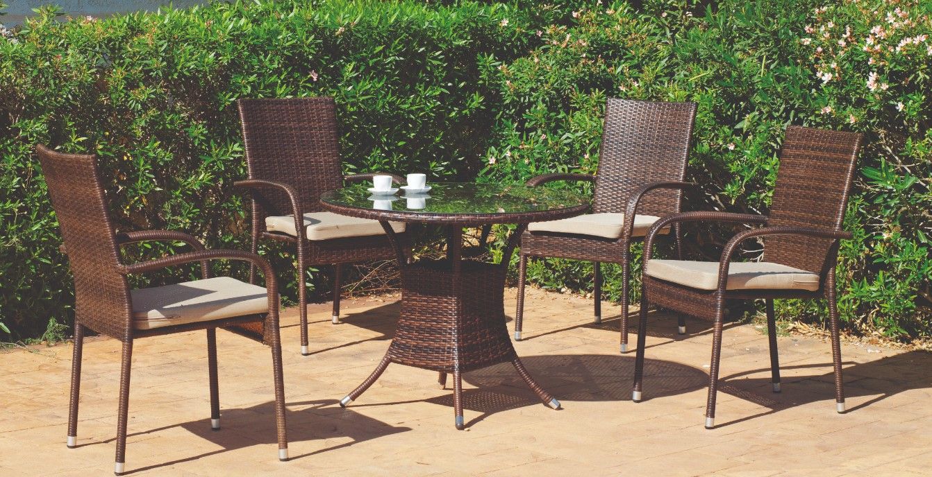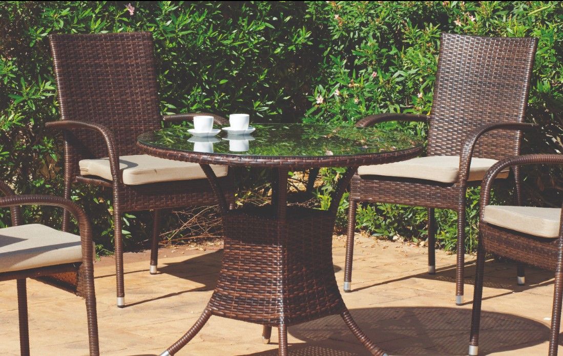 4 SILLONES HUITEX APILABLE + 1 MESA HUITEX CON TAPA CRISTAL TEMPLADO + 4 COJINES.