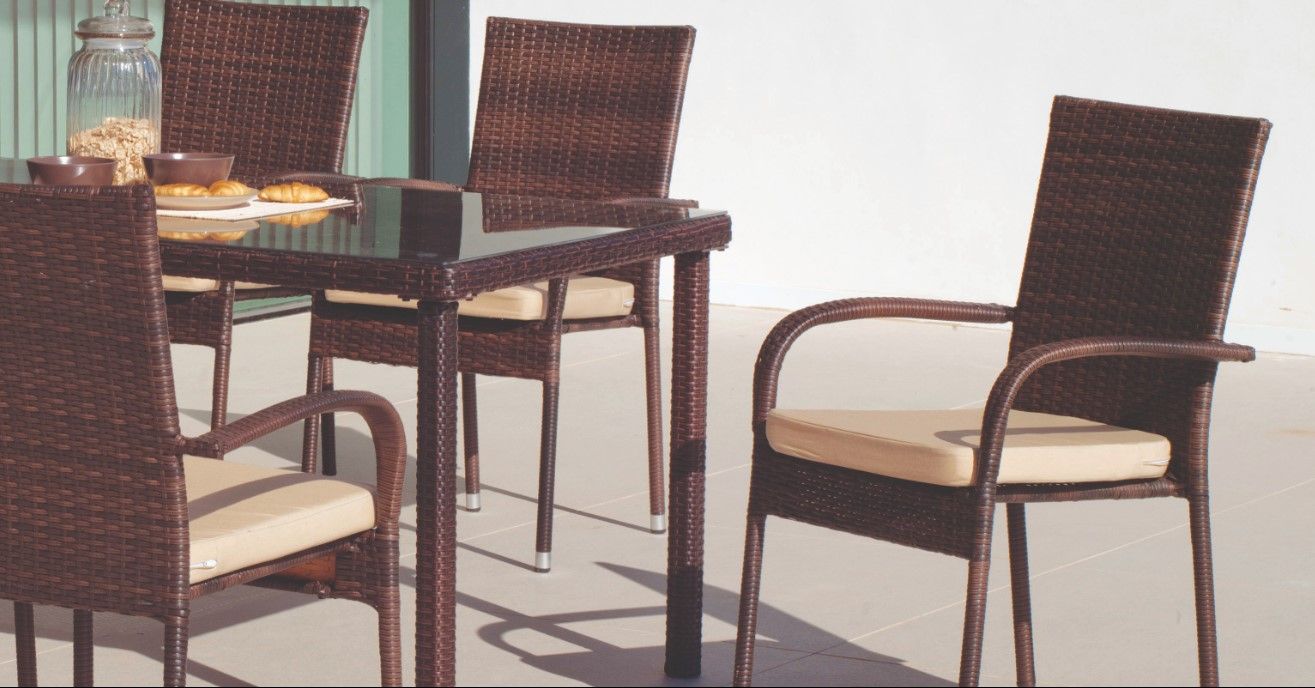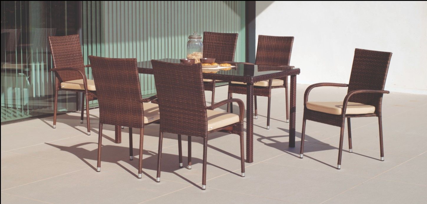 6 SILLONES HUITEX APILABLE + 1 MESA HUITEX CON TAPA CRISTAL TEMPLADO + 6 COJINES.