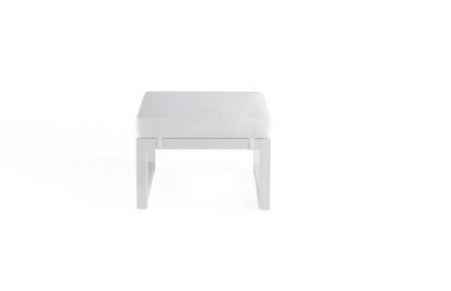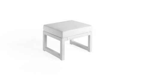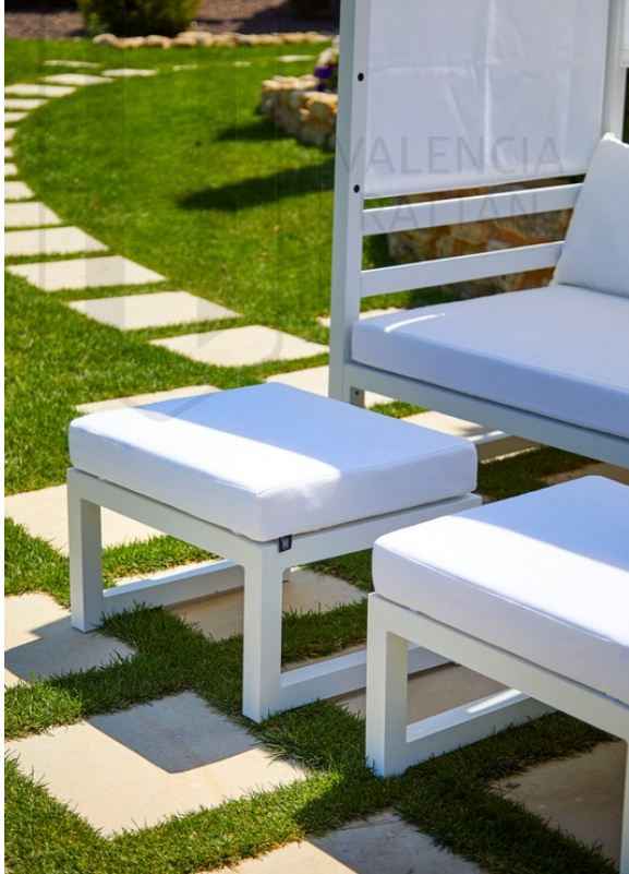 Reposapiés de estructura de aluminio 1,5mm color blanco. La tela de la tapicería es en poliéster 100% color blanco, este textil sintético fabricado de polímeros tiene la ventaja de que no encoge ni se deforma, tiene una gran durabilidad, aguanta bien la humedad, seca rápido y no presenta casi arrugas, el grosor de la tapicería es de 10 cm y es desenfundable.