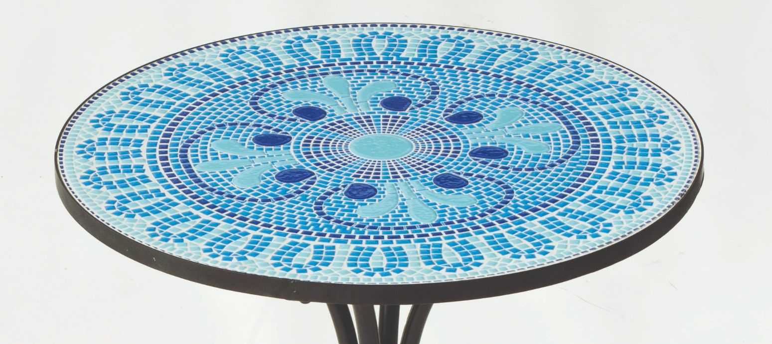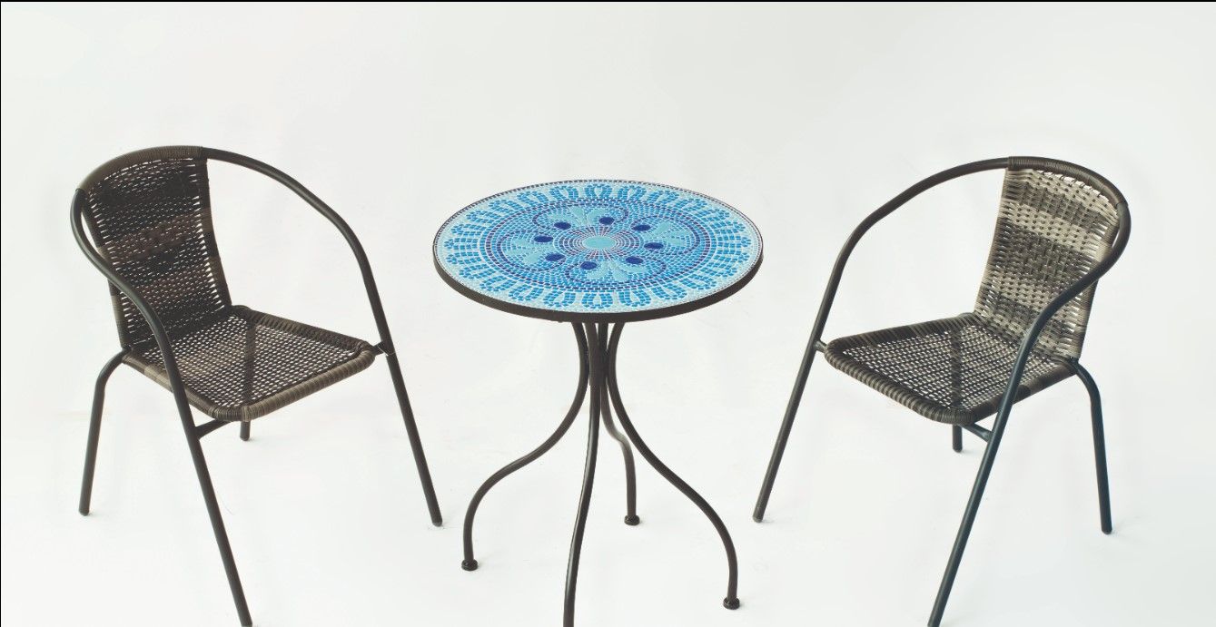 MESA CON TAPA DE MOSAICO Y SILLON CON TEJIDO SINTETICO.