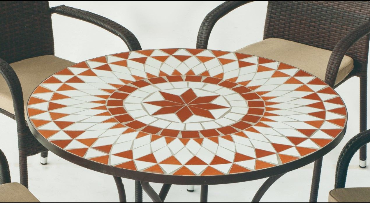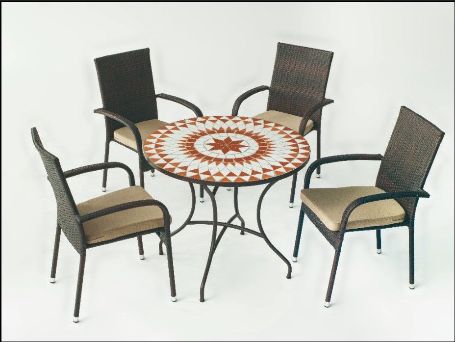 TAPA DE LA MESA DE MOSAICO. SILLON TEJIDO EN HUITEX COLOR MARRON.
