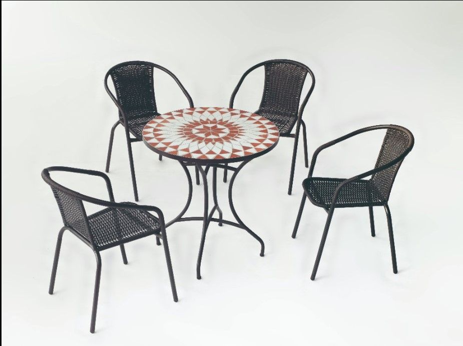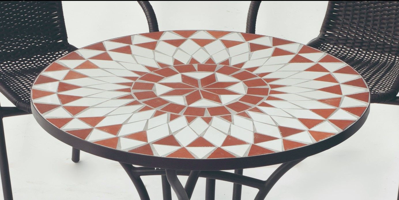 MESA CON TAPA DE MOSAICO Y SILLON CON TEJIDO SINTETICO.