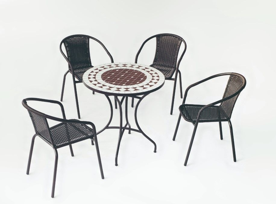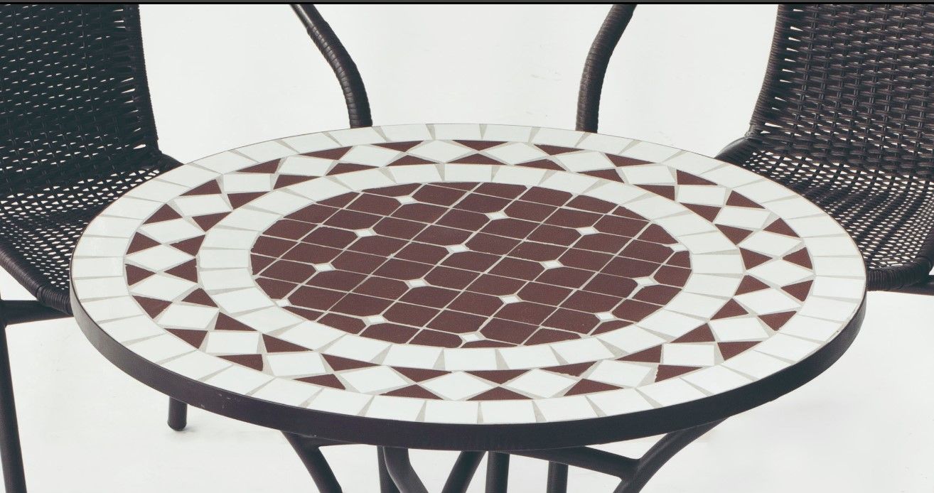 MESA CON TAPA DE MOSAICO Y SILLON CON TEJIDO SINTETICO.