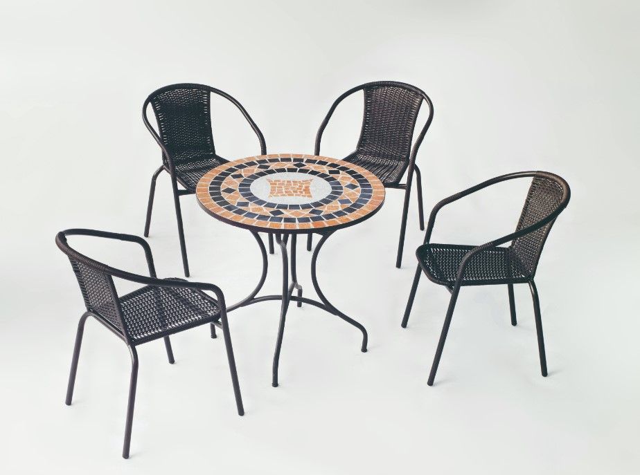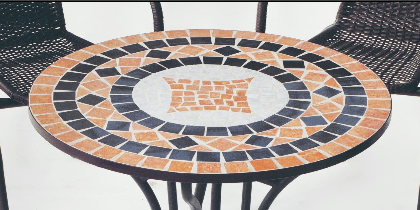 MESA CON TAPA DE MOSAICO Y SILLON CON TEJIDO SINTETICO.
