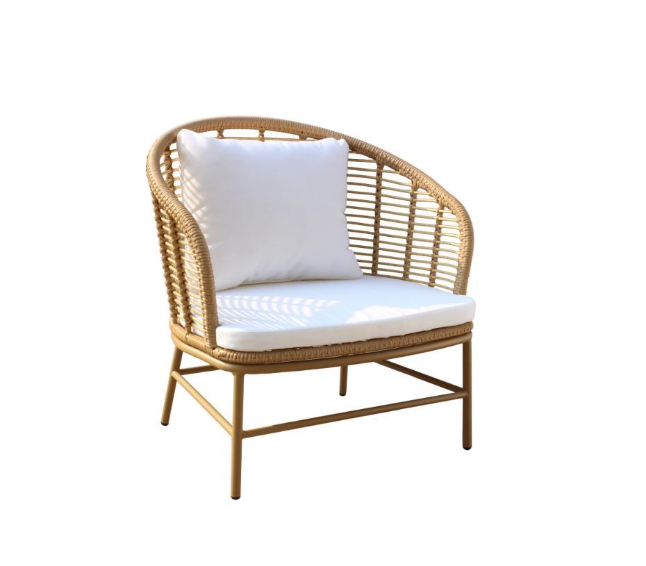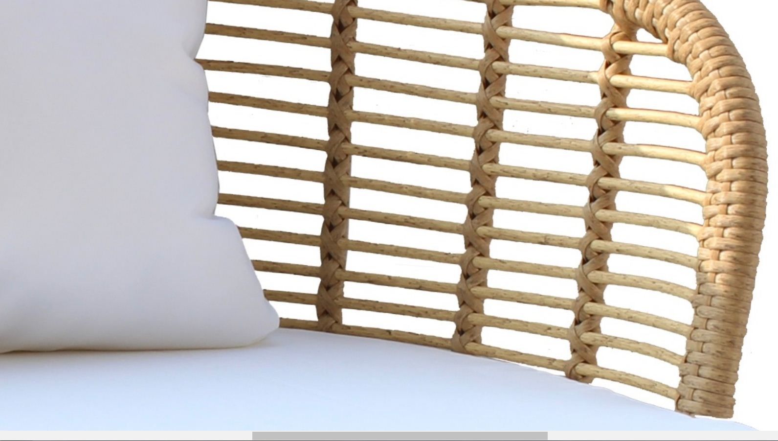 ARIEL es un elegante sillón con estructura de aluminio y tejido en rattan sintético color natural con tapicería en color blanco. Ideal para zonas outdoor: terrazas, patios, balcones…