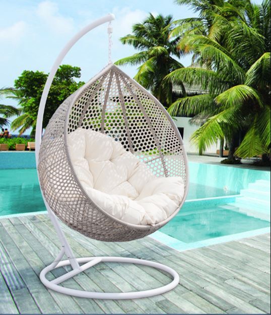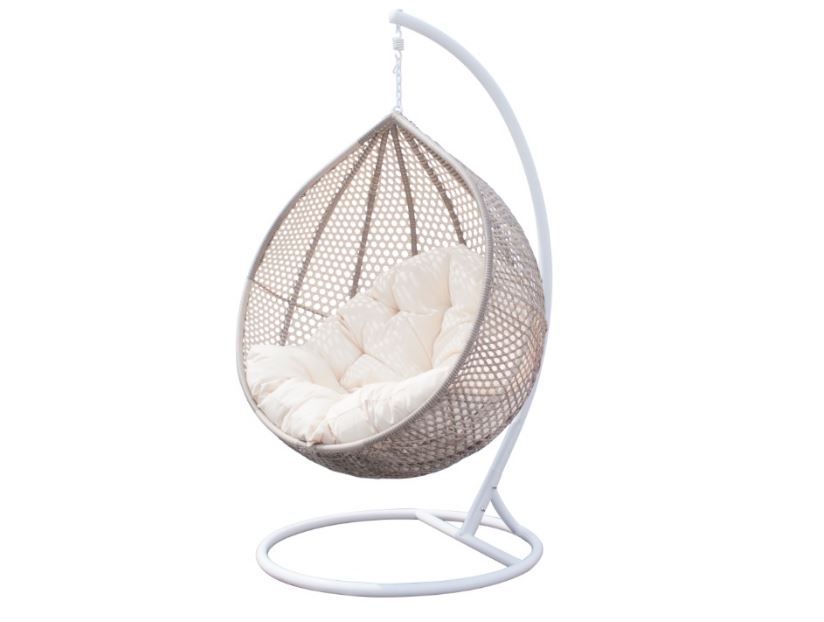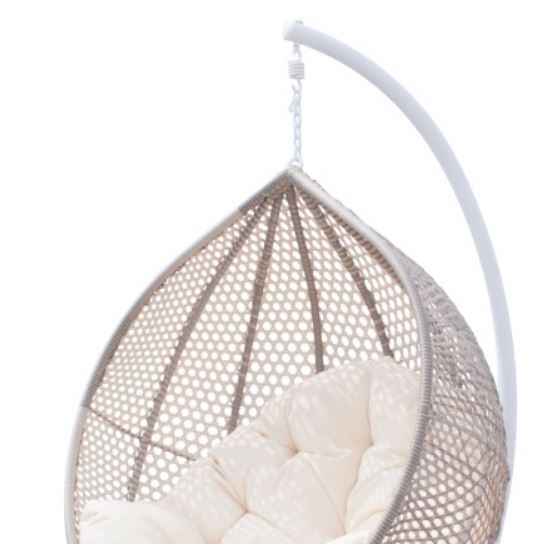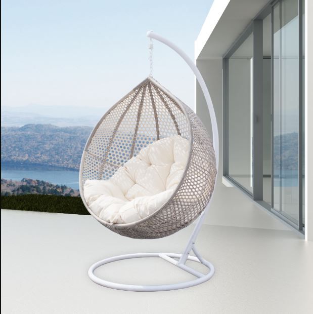 Elegante sillón colgante FOBOS Blanco con estructura de acero, cesto con estructura de aluminio tejido en rattan sintético blanco. Incluye tapicería interior color blanco.