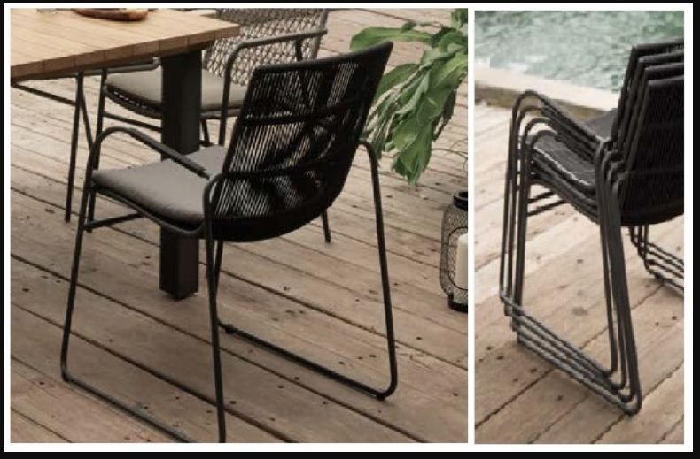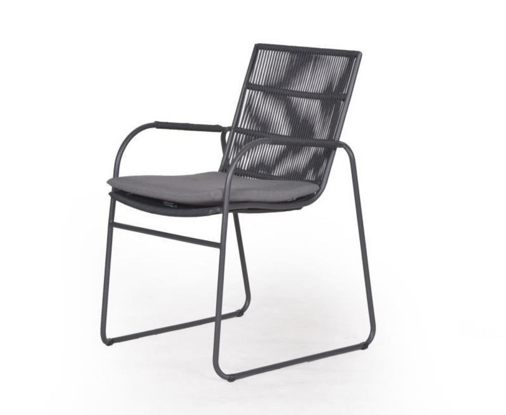 Sillón apilable GINA con estructura de acero inox y tejido en cuerda náutica color antracita. Incluye tapicería color antracita.
