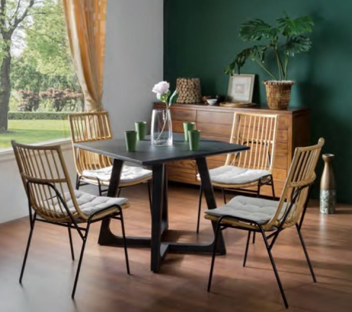 Sillón KAYLA con estructura de ratán tohiti natural. Patas de acero 16 mm color antracita. Incluye cojín.