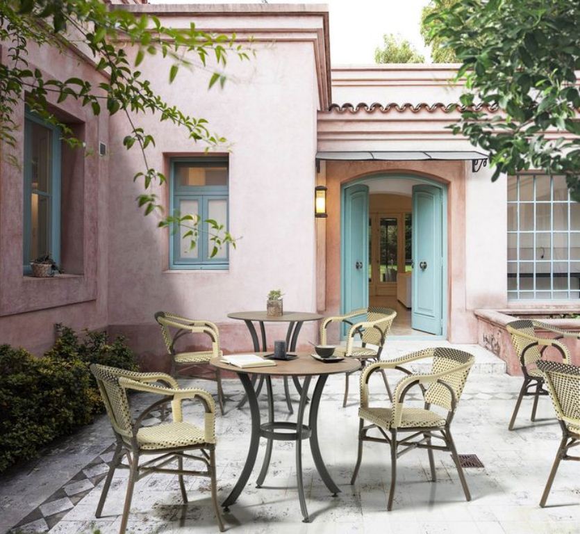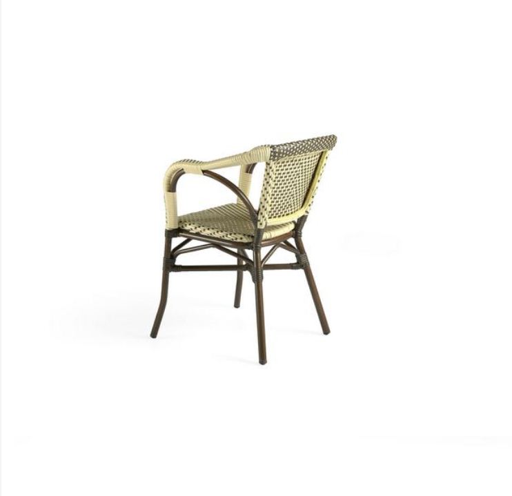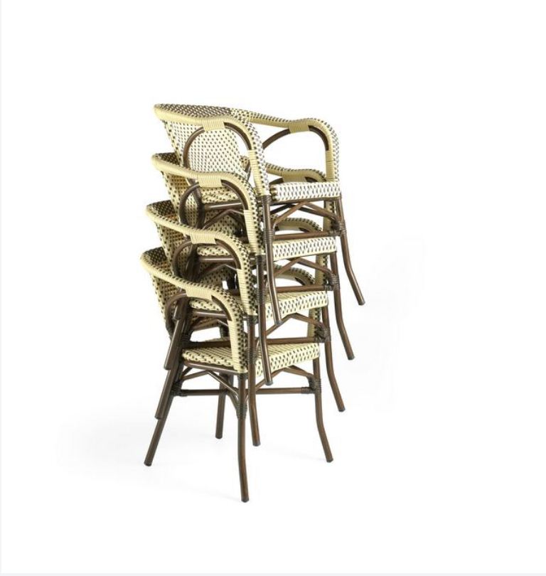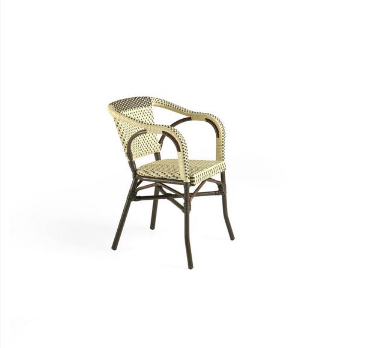 Sillón apilable de estructura de aluminio de 1,5mm imitación al bambú y tejido en rattan sintético plano bicolor crema-choco, esta fibra de alta calidad no procede de resinas recicladas, por lo que son indeformables y muy resistentes al sol y a la humedad así pues, este mueble puede permanecer en el exterior sin necesidad de protección o mantenimiento alguno, aunque para alargar la vida útil de su mueble de exterior, aconsejamos tapar con una funda opaca e impermeable si no se van a utilizar en periodos prolongados de tiempo. Protección en las patas con tacos de plástico. Al ser apilable facilita el ahorro de espacio en su almacenamiento y recogida. Este modelo es todo un clásico.