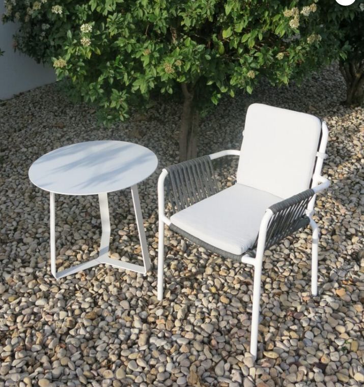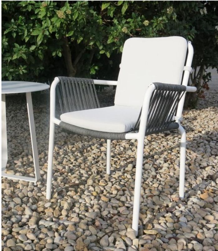 Sillón SUMERIO BLANCO-ASFALTO con estructura de aluminio blanco con tapicería en asiento y respaldo color único. Apilable.