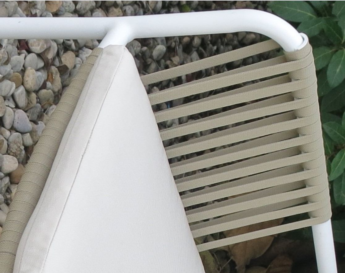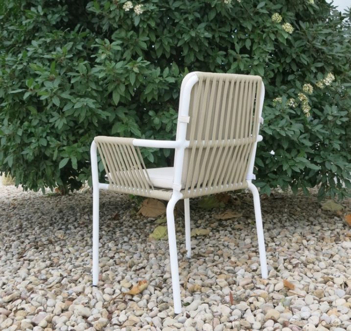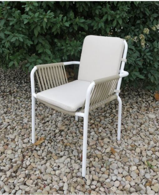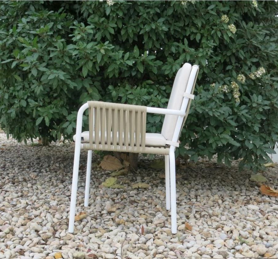 Sillón SUMERIO BLANCO-CREMA con estructura de aluminio blanco con tapicería en asiento y respaldo color único. Apilable.