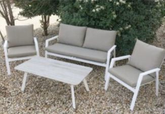 Tresillo MICERINOS con estructura de aluminio color Blanco y textilene. Tapicería 100% Olefin color único.