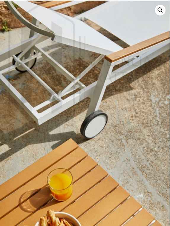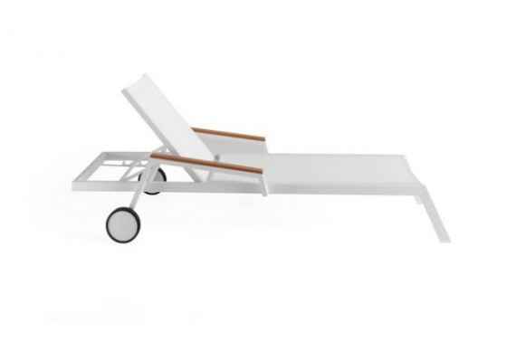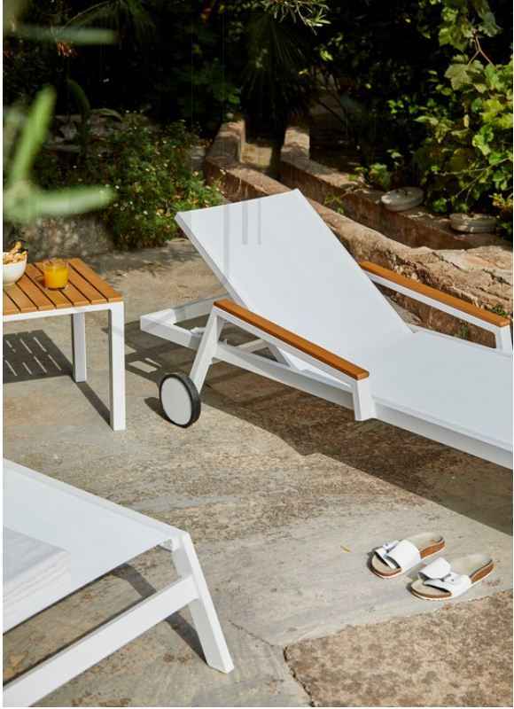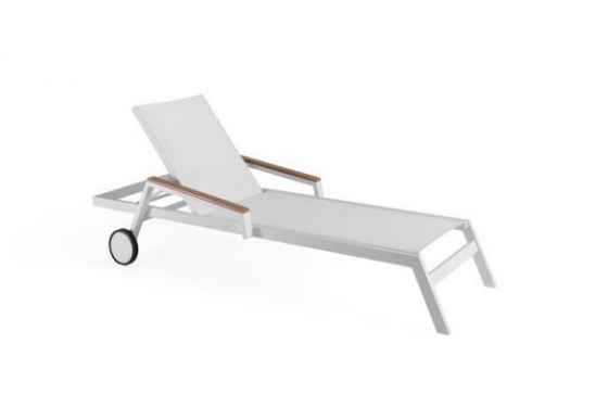 Tumbona con una estructura de aluminio color blanco y brazos de polywood color teca que le confiere una estructura muy solida y a la vez liviana en su peso. Fabricado en vinilo recubierto de PVC, esta malla de vinilo es altamente resistente a la exposición del sol, agua, cambios de temperatura, humedad y al aire libre, por lo que es altamente recomendable para su uso en el exterior. Dispone de 4 posiciones para regular el respaldo y alcanzar la posición que le resulte mas cómoda así como 2 ruedas en las patas superiores para facilitar el transporte y protectores de plástico en las patas inferiores. Al ser apilable facilita el ahorro de espacio en su almacenamiento y recogida. Esta moderna tumbona es perfecta para disfrutar de su tiempo libre en la piscina, terraza o jardín.